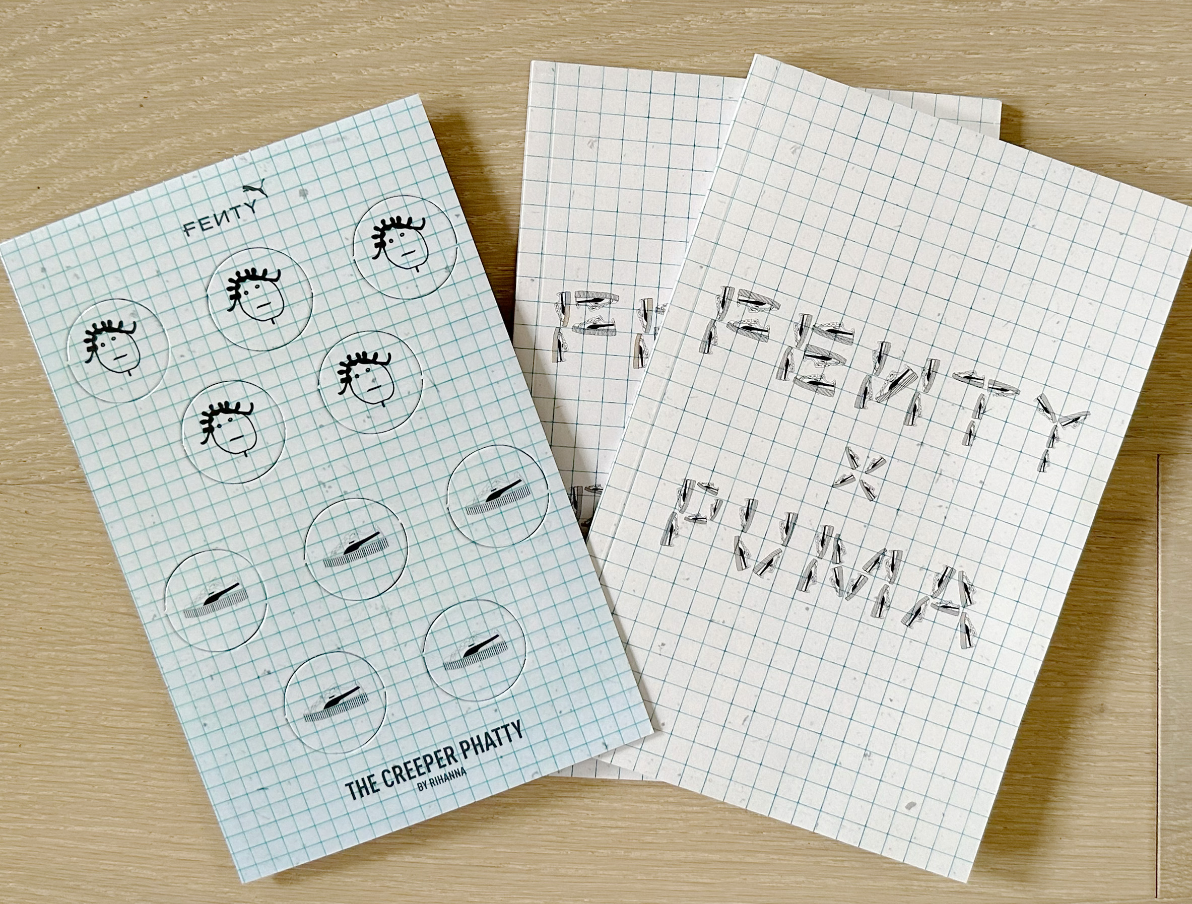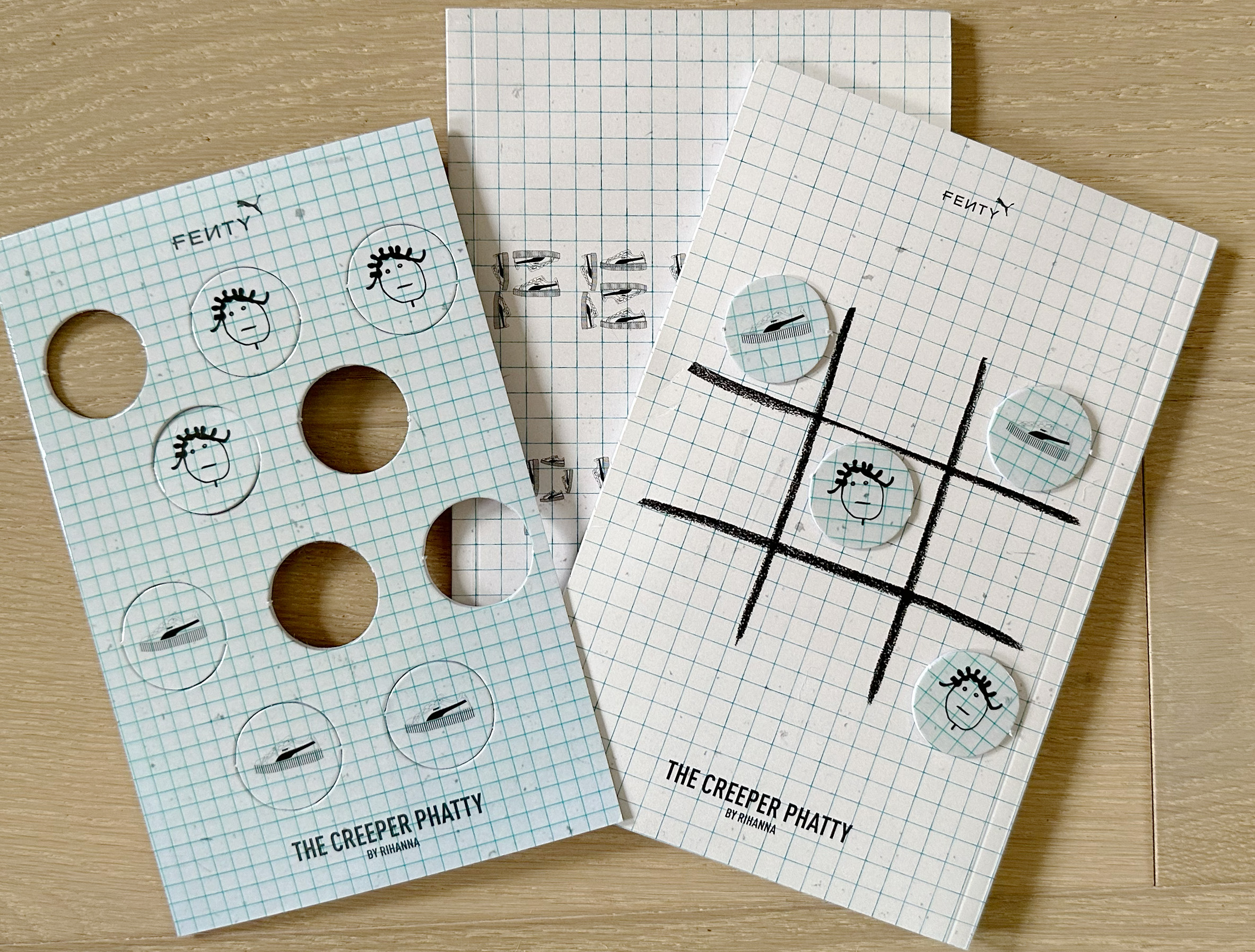 In collaboration with the Entertainment division and Fenty, we created a school/class journal to go along with Fenty x Puma footwear. The journal includes custom branding and tic-tac-toe pieces to play the game on the back cover.
